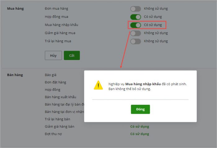 • Đối với các nghiệp vụ đã có phát sinh, khi tích chọn ẩn nghiệp vụ, chương trình sẽ cảnh báo và không cho phép ẩn nghiệp vụ này.