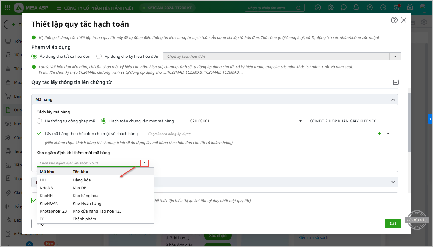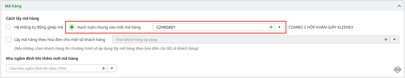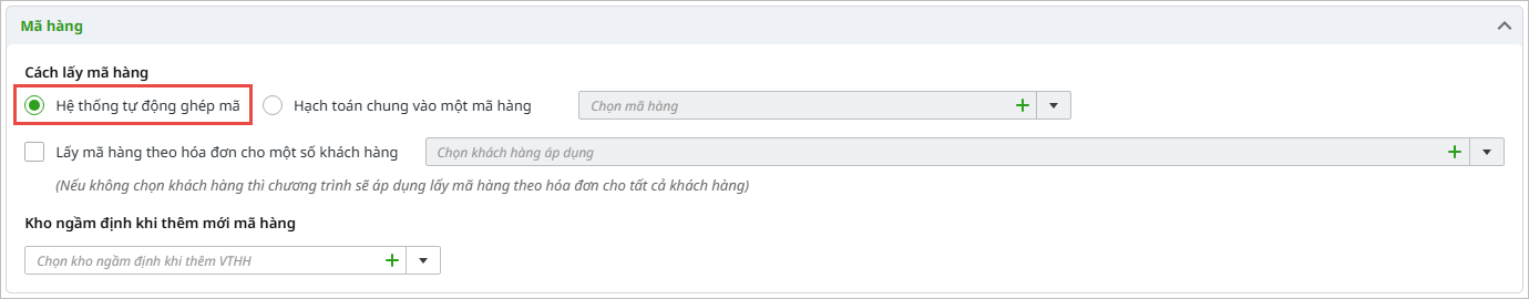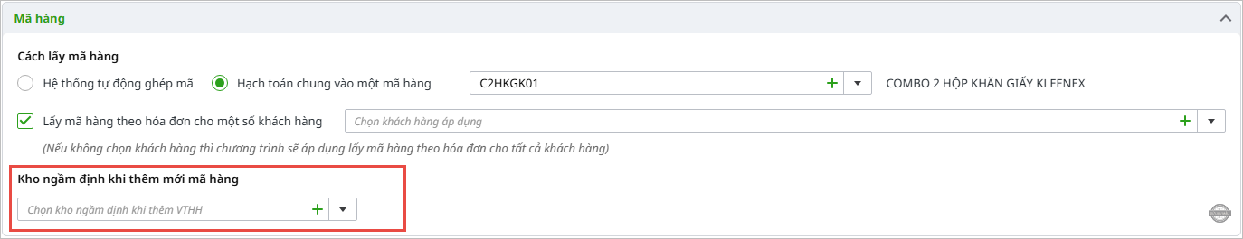 - Tại đây, chương trình cho phép thiết lập Cách lấy mã hàng và Kho ngầm định khi thêm mới mã hàng.