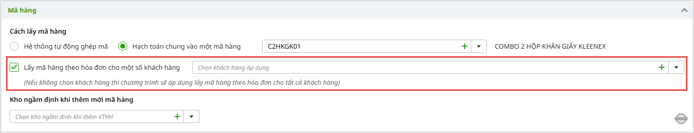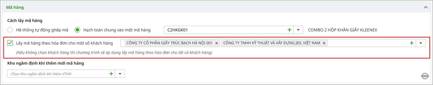 Đồng thời với 1 trong 2 lựa chọn trên, chương trình cho phép người dùng chọn Lấy mã hàng theo hóa đơn cho một số khách hàng để phù hợp với nhu cầu thực tế của đơn vị.