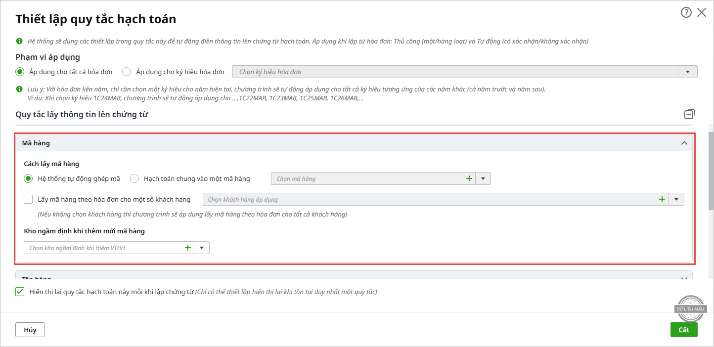 - Trên form Thiết lập Quy tắc hạch toán, tại phần thiết lập Quy tắc lấy thông tin lên chứng từ, người dùng tìm đến mục Mã hàng: