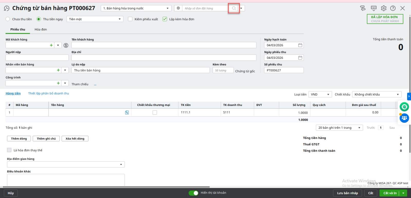 Bước 3: Chương trình hiển thị giao diện chứng từ bán hàng: