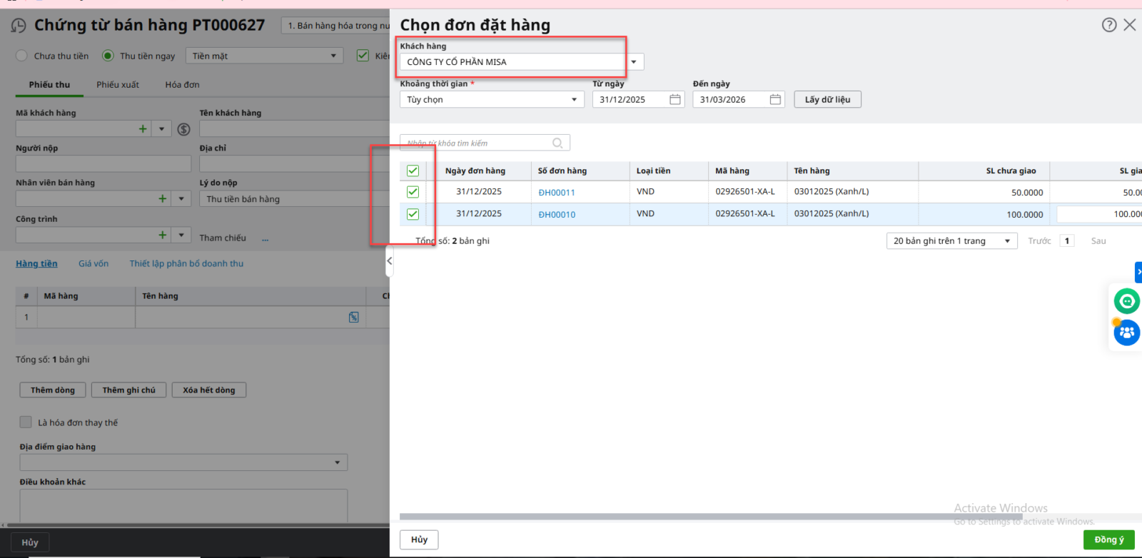 Lưu ý: Có thể chọn nhiều Đơn đặt hàng để lập Chứng từ bán hàng kiêm phiếu xuất kho bằng cách: Tích vào biểu tượng kính lúp\ Chọn Mã khách hàng\ Nhấn Lấy dữ liệu\ Tích chọn các Đơn đặt hàng cần lập chứng từ