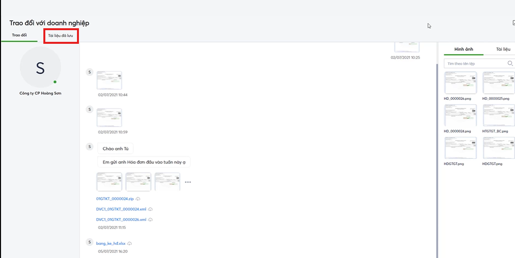 Bước 2: Chương trình sẽ chuyển đên giao diện Trao đổi với doanh nghiệp, chọn tab Tài liệu đã lưu