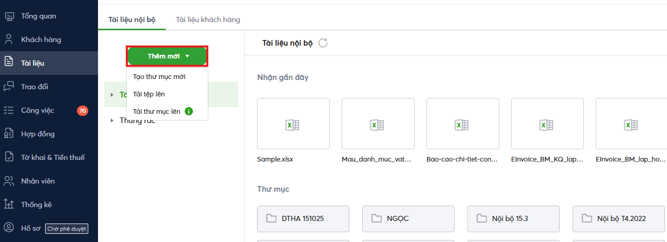 Bước 2: Tại đây, KTDV có thể tạo mới thư mục, tải tệp hoặc thư mục lên chương trình bằng cách nhấn vào chức năng Thêm mới