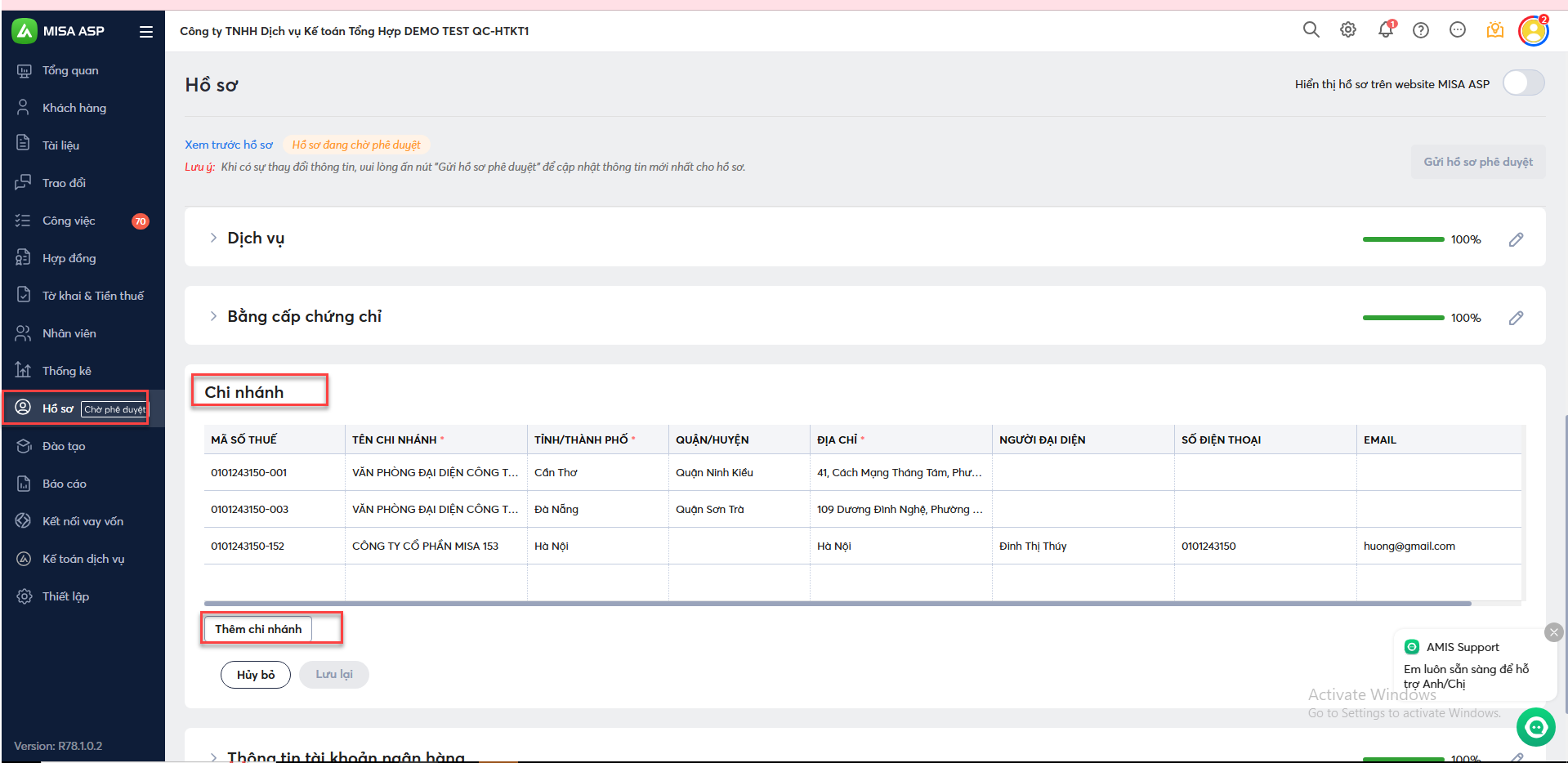 - Vào mục Hồ sơ, nhấn Thêm chi nhánh