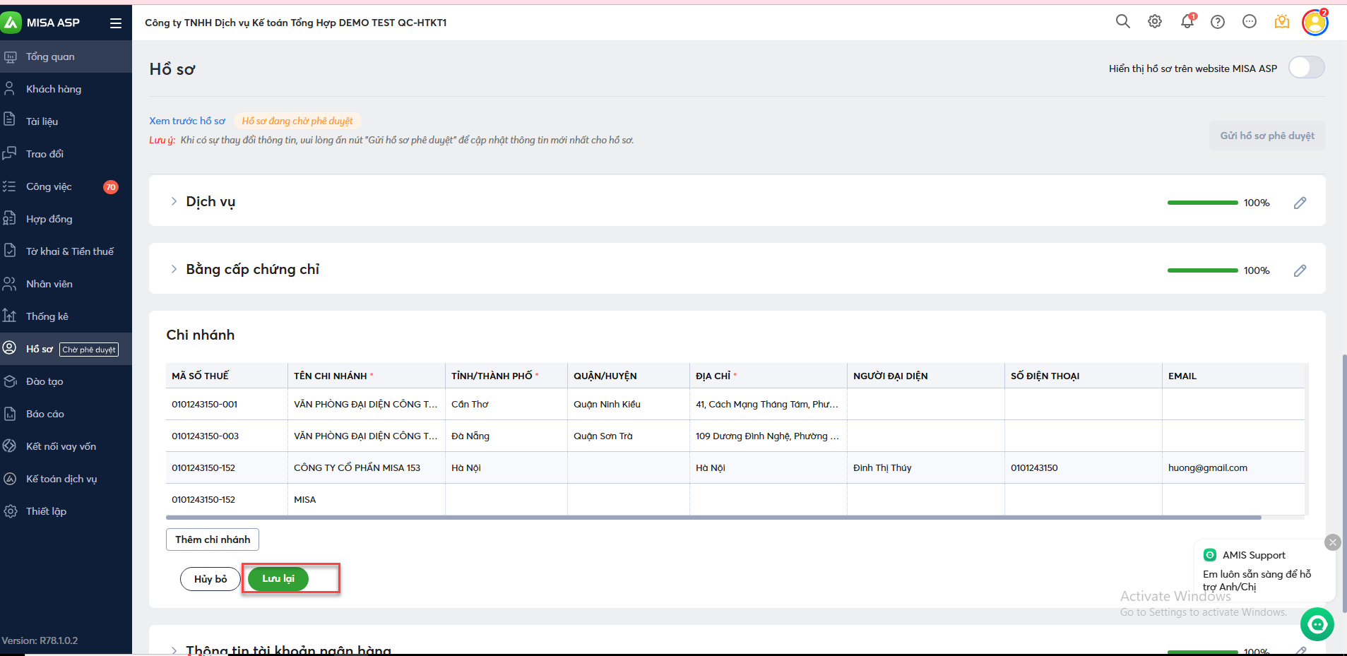 Bước 2: Khai báo thông tin chi nhánh, nhấn Lưu lại