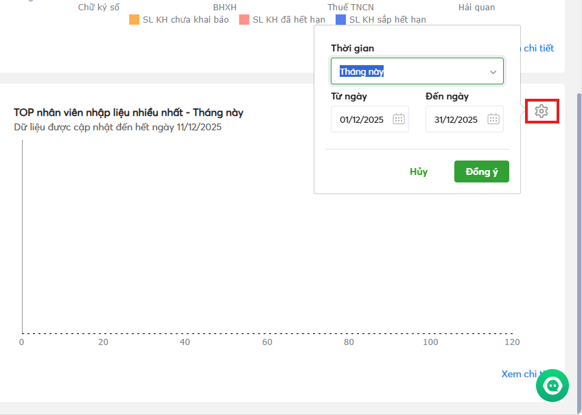 - Anh/Chị có thể nhấn vào biểu tượng bánh răng ⚙ trên góc phải của biểu đồ Top nhân viên nhập liệu nhiều nhất, chọn khoảng thời gian cần lấy lên dữ liệu. Sau đó nhấn Đồng ý